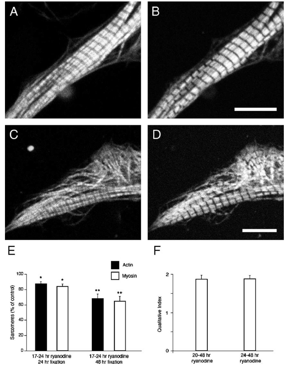 Note the moderate decrease in sarcomeric organization at 24 h and that, despite ryanodine washout, assembly does not recover in the following 24 h period. (F) Later