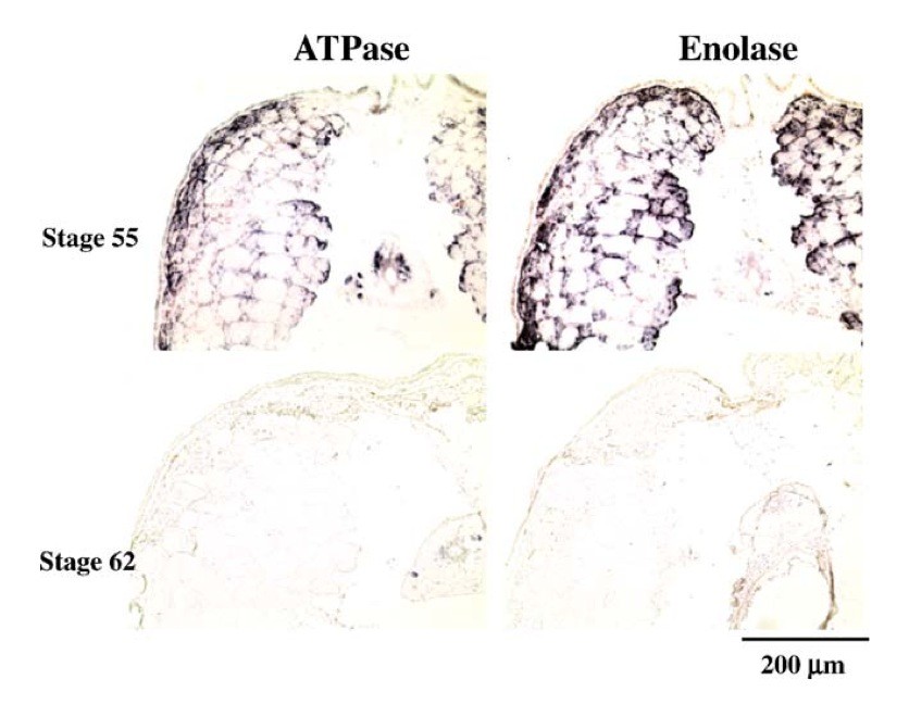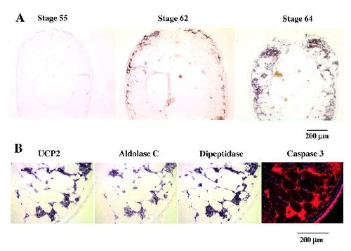 Thyroid hormone (TH) controlled gene expression profiles have been studied in the tail, hind limb and brain tissues during TH-induced and spontaneous Xenopus laevis metamorphosis. Amplified cRNA probes mixed with a universal standard were hybridized to a set of 21,807-sense strand 60-mer oligonucleotides on each slide representing the entries in X. laevis UniGene Build 48. Most of the up-regulated genes in hind limb and brain are the same. This reflects in part the fact that the initial response to TH induction in both tissues is cell proliferation. A large number of up-regulated genes in the limb and brain programs encode common components of the cell cycle, DNA and RNA metabolism, transcription and translation. Notch is one of the few genes that is differentially expressed exclusively in the brain in the first 48 h of TH induction studied in these experiments. The TH-induced gene expression changes in the tail are different from the limb and brain programs. Distinct muscle and fibroblast programs were identified in the tail. Dying muscle fibers in tail (marked by active caspase-3) up-regulate a group of genes that include proteolytic enzymes. At the climax of metamorphosis, tail muscle down-regulates more than half of the genes that encode the glycolytic enzymes in the cytoplasm and the tricarboxylic acid pathway and all five complexes of the electron transport system in mitochondria. These changes in gene expression precede the activation of caspase-3. Some of these same energy metabolism-related genes are up-regulated in the limb and brain programs by TH. A prominent feature of the tail fibroblasts is the down-regulation of several collagen and other extra cellular matrix genes and the up-regulation of hydrolytic enzymes that are responsible for dissolving the notochord and resorbing the tail.
