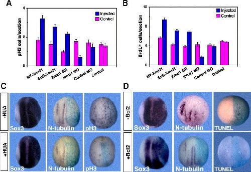Fig. 8. Xmxi1 induces proliferation in the open neural plate of Xenopus embryos. MT-Xmxi1 (500 pg), EnR-Xmxi1 (500 pg), and Xmxi1-GR (500 pg, induced at stage 10.5 with dexamethasone), Xmxi1-MO (12.5 ng), or the control-MO (Co-Mo) (12.5 ng) was injected in Xenopus embryos. Proliferation on the injected side compared with the noninjected side was measured by counting (A) pH3 or (B) BrdU-positive cells of 15 consecutive sections of five embryos in the open neural plate region. Shown is the average number of positive cells per section. Error bars indicate the standard error of the mean. (C) Forced cell cycle arrest does not alter the phenotype of Xmxi1-injected embryos. In Xmxi1-GR-injected embryos, proliferation was blocked by HUA treatment at stage 10 and induced at stage 10.5 with dexamethasone. (D) Inhibition of MT-XMxi1-induced apoptosis does not rescue loss of N-tubulin. Overexpression of MT-Xmxi1 (500 pg) led to an increase in apoptosis as seen by TUNEL staining (upper panel, right). Coinjection of human Bcl2 mRNA (500 pg) blocked apoptosis (lower panel, right) but did not influence the effects of MT-Xmxi1 on Sox3 and N-tubulin.