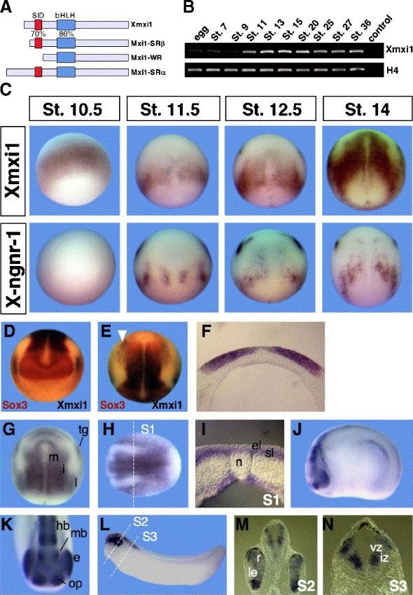 Fig. 1. (A) Comparison of the predicted amino acid sequence of Xmxi1 with the mouse Mxi1 isoforms. GenBank accession number Xmxi1: DQ137875. (B) RT-PCR analysis of Xmxi1 at different stages of development. Histone H4 was used as a loading control. (C) Whole-mount in situ hybridization expression analysis of Xmxi1 in comparison with X-ngnr-1. (DâF) Double labeling of Xmxi1 and Sox3 expression. Sox3, red; Xmxi1, dark blue. (D) Stage 14, anterior view. (E) Stage 14, dorsal view. White arrowhead marks the lateral stripe of Xmxi1. (F) Transversal section of E. (GâN) Spatial expression of Xmxi1 during later stages of Xenopus development. (G) Stage 13, dorsal, anterior up. (H) Stage 16, dorsal view, anteriorleft. (I) S1 transversal section. (J) Stage 22, lateral. (K) Stage 27, anterior (L) Stage 37, lateral. (M) S2 transversal section. (N) S3 transversal section, dark brown staining at the roof of the spinal chord is pigmentation not Xmxi1 staining. el, epithelial layer; hb, hindbrain; i, intermediate; iz, intermediate zone; l, lateral; le, lens; m, medial; mb, midbrain; n, notochord; op, olfactory placode, r, retina; sl, sensory layer; st, stage; tg, trigeminal placodes; vz, ventricular zone.