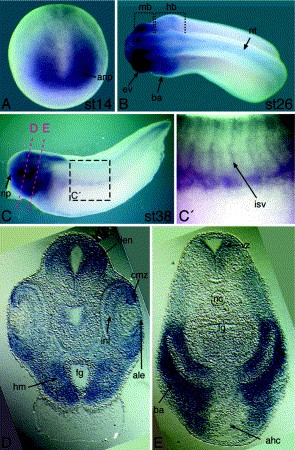 The zinc finger protein CTCF has been shown to mediate multiple functions connected to gene repression. Transcriptional inhibition as well as enhancer blocking and chromatin insulation are documented for CTCF in men, mice and chickens. Additionally, hCTCF has been linked to epigenetics and disease. In line with these basic cellular functions, CTCF has been found to be expressed in every cell type and adult tissue tested and has thus been deemed an ubiquitous protein. Here, we report the identification of the CTCF homologue from Xenopus and the analysis of the spatio-temporal expression of xCTCF during embryogenesis. Within the DNA binding domain, xCTCF is virtually identical to other identified vertebrate CTCF proteins. Homology also extends to other conserved regions that are important for CTCF function. Although xCTCF mRNA is present during all stages of early Xenopus development, a remarkable increase in expression is observed in neuronal tissues. Early in development, xCTCF is highly expressed in the neural plate and later in the neural tube and developing brain. By tailbud stage, elevated expression is also seen in the developing sensory organs of the head. This is the first detailed description of the expression pattern of a vertebrate insulator protein during embryogenesis.