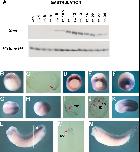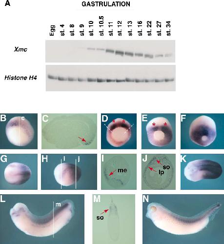 Fig. 2. Dynamic spatialemporal expression of Xmc during embryonic development. (A) RT-PCR analysis of Xmc expression during embryonic development (stages according to Nieuwkoop and Faber, 1967). Histone H4 serves as internal loading control. (B) Whole-mount in situ hybridization analysis of Xmc expression. Spatial expression during early (B, C), mid (D, E) and late (F) gastrulation (vegetal views), neurulation (G, dorsal and lateral view, respectively; anterior to the left), and tailbud and tadpole stage (K). Asterisks indicate the elevated bilateral dorsal expression and stippled lines indicate the margin of organizer explants used for the subtraction screen. Abbreviations: me, mesenchyme; lp, lateral plate and so, somite.