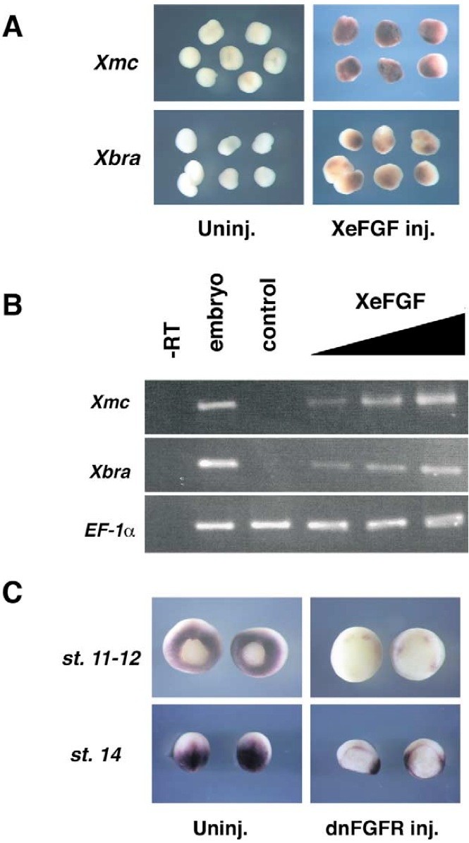 Fig. 4. FGF signaling is necessary and sufficient to activate Xmc expression. (A) Whole-mount in situ hybridization analysis for Xmc and Xbra expres- sion in control and XeFGF-injected albino cap explants. Embryos were injected with ,160 pg of XeFGF mRNA in one animal blastomere at the two-cell stage. (B) RT-PCR analysis for Xmc and Xbra expression in control caps and animal caps injected with increasing doses of XeFGF (in two-fold increments from 10 to 40 pg). EF-1a serves as loading control. (C) Expression of Xmc in control and dnFGFR-injected mid-gastrula (stages 112) and early neurula embryos (stage 14). Embryos were injected with 400 pg of dnFGFR mRNA in four blastomeres at the four- cell stage.