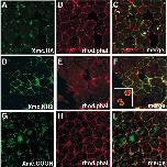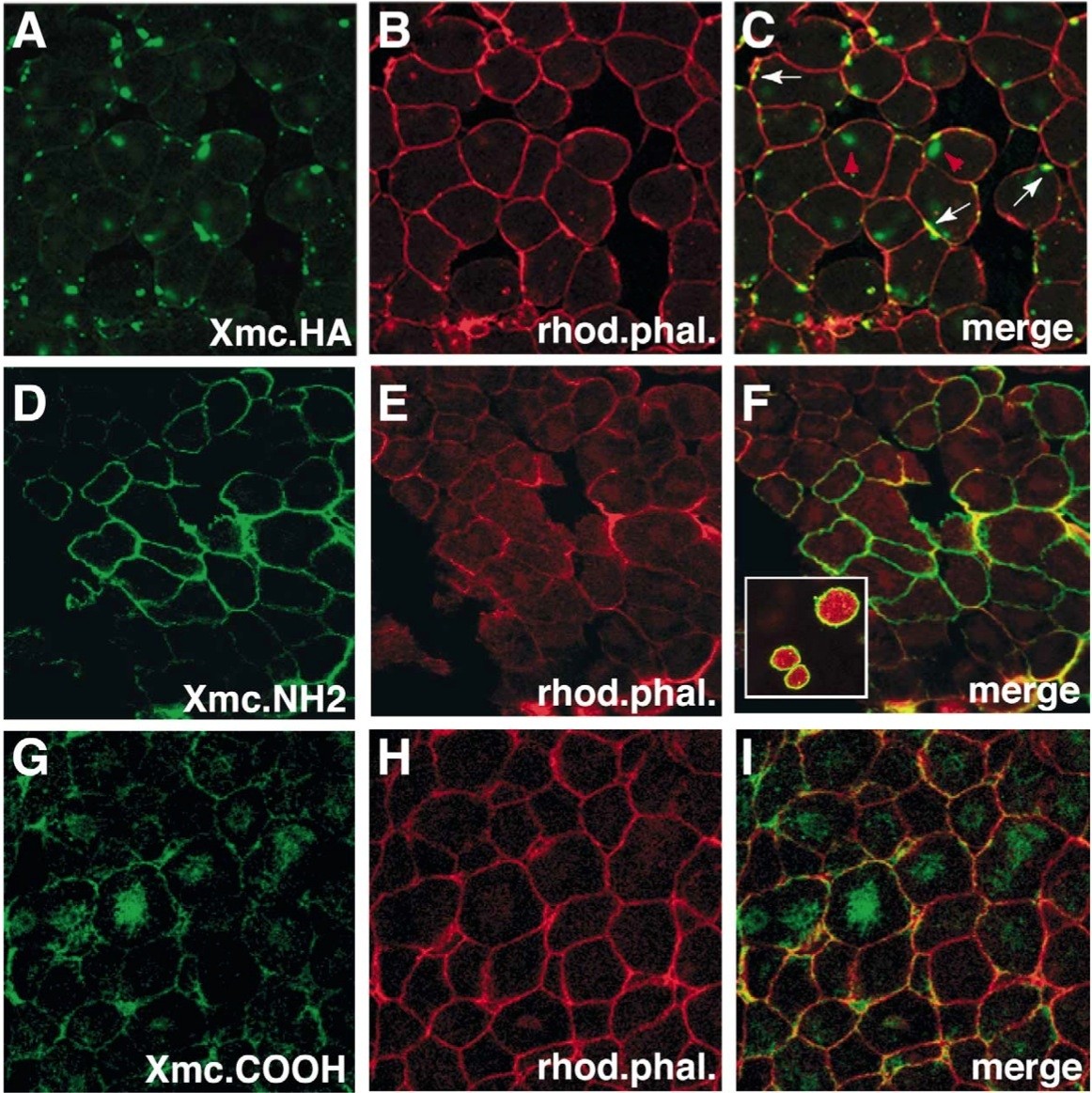 Fig. 5. Subcellular localization of Xmc and deletion constructs in animal cap explants. Confocal images showing XmcA, Xmc.NH2A and Xmc.COOHHA distribution (green channel), cortical actin visualized by rhodamin phalloidin (red channel) and the overlay. Embryos were injected with 800 pg of mRNA in two animal blastomeres at the two-cell stage. (A) Full-length Xmc is localized in a vesicular pattern in the cytoplasm (red arrowheads) and associated with the inner cell membrane (white arrows). (D) Xmc.NH2 is quantitatively recruited to the plasma membrane. At high doses, cells tend to round up and dissociate (see inset). (G) Xmc.COOH is localized in a diffuse perinuclear manner.