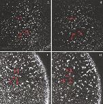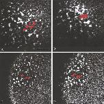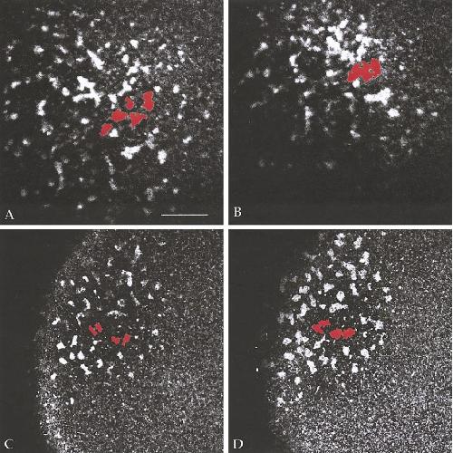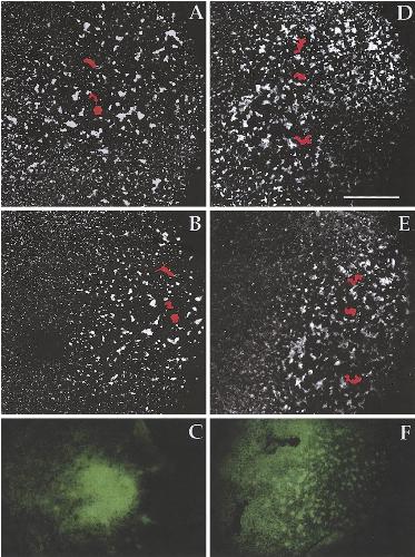 FIG. 2. Cortical rotation in control and Xklp1-depleted prick-activated oocytes. Some sample germ plasm islands have been colored red to compare their movements. Cortical rotation occurs normally in control (A�C) and Xklp1-depleted (D�F) oocytes, but germ plasm does not localize to the vegetal pole in Xklp1-depleted oocytes (F) as it does in the controls (C). Frames shown in (A, B) and (D, E) are 13 min apart. Scale bar, 74 um.