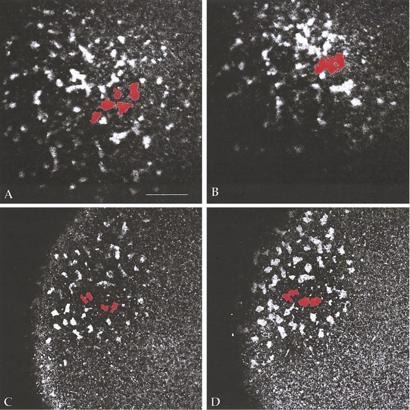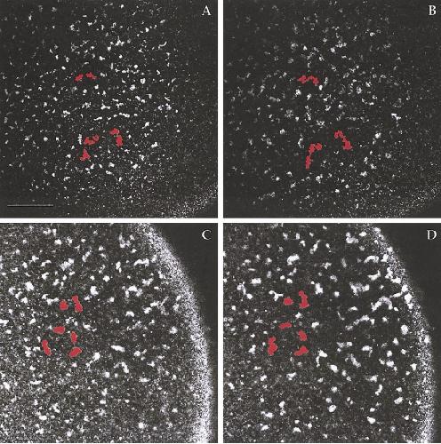FIG. 4. Phase three (surface contraction waves) in control (A, B) and Xklp1-depleted (C, D) activated oocytes. In the control, frames are 15 min apart and are immediately before and after the passage of a single wave, which occurred 1.5 h after oocyte activation. The highlighted islands of germ plasm are pushed together by the wave, as are the groups surrounding them (not highlighted), and the total area of egg cortex occupied by germ plasm islands is reduced. In the Xklp1-depleted, the frames are 50 min apart, starting 1 h after oocyte activation. During this period, at least two waves normally occur in control eggs. The total area occupied by germ plasm islands remains the same. Scale bar, 74 um