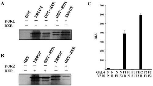 FIG. 4. FOR interacts with RXR both in vitro and in vivo. A and B, GST-pull-down assay of FOR1 and FOR2. Equal amounts of in vitro