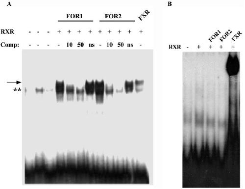 FIG. 5. FORs specifically bind IR1 element from PLTP gene promoter. End-labeled oligonucleotides corresponding to IR1 from PLTP (A) gene promoter or EcRE (B) of the hsp27 promoter were incubated with in vitro transcribed and translated FOR1, FOR2, and RXR in various combinations as indicated in the Fig. 10- or 50-fold molar excess of corresponding specific unlabeled oligonucleotides or unrelated oligonucleotides (ns) were included in the reactions as indicated. The DNA-protein complexes were resolved by 5% non-denaturing PAGE and analyzed by autoradiography.