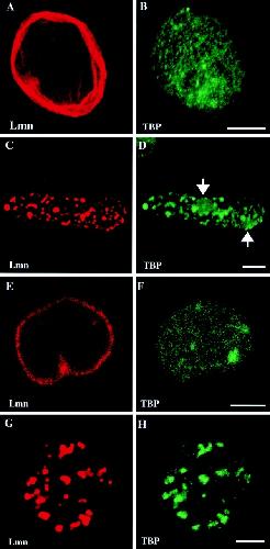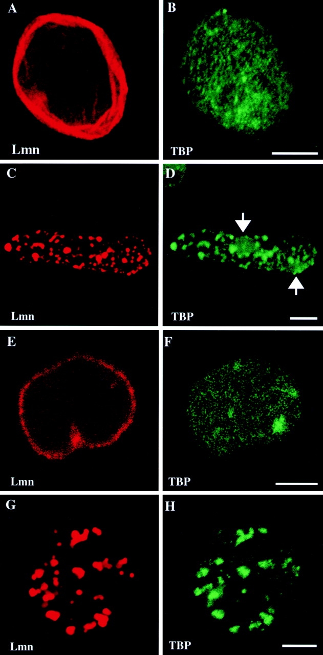 Figure 6. Disruption of lamin organization alters the distribution of TBP. BHK 21 cells (A–D) and embryonic nuclei (E–H) stained with a rabbit anti-TBP (B, D, F, and H), rat anti–human LA (A and C), and a monoclonal anti–Xenopus LB3 (E and G). An uninjected BHK 21 cell is shown (A and B). An embryonic nucleus in extract treated with buffer is shown (E and F). Both display normal distributions of lamin (A and E) and TBP (B and F). In BHK 21 cells (C and D) and embryonic nuclei (G and H), ΔNLA treatment resulted in TBP (D and H) and lamins (C and G) colocalizing in nucleoplasmic aggregates. Arrows point to the location of nucleolar regions as seen by phase contrast (unpublished data). Images are confocal sections through the center of the nuclei. Bars, 5 μm.