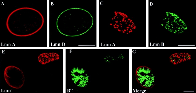 Figure 1. Disruption of lamin organization alters the distribution of splicing factors. The organization of A- and B-type lamins in untreated BHK 21 cells (A and B) and cells microinjected with ΔNLA (C and D) were examined by immunofluorescence with antibodies specific to A- or B-type lamins. Microinjection of ΔNLA disrupted the organization of both B- and A-type lamins (C and D). Immunofluorescence showing the distribution of LA and B′′, a U2-specific binding protein (E–G). In the control cell on the left, splicing factor B′′ is distributed in a characteristic pattern of speckles and interconnecting material within the nucleoplasm. In the ΔNLA-injected cell (upper right), the interconnecting material is absent and the number of B′′ speckles is greatly reduced (E and F). Note that the lamin aggregates and the B′′ speckles do not co-align (G). Bars, 5 μm.