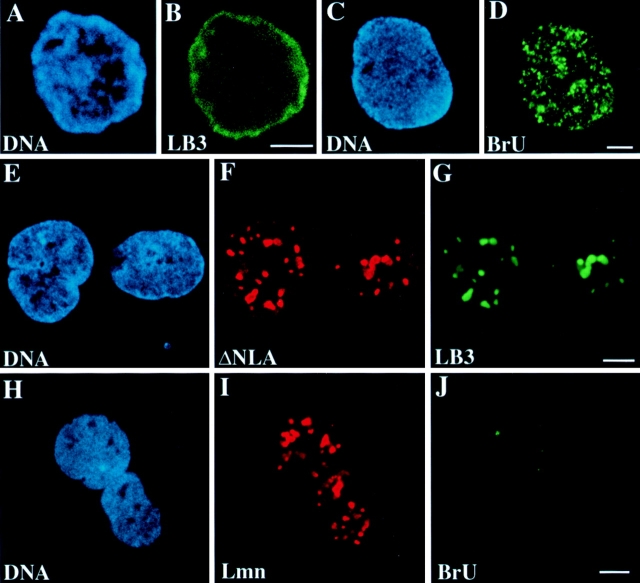 Figure 3. Disruption of lamin organization in embryonic nuclei inhibits the incorporation of BrU. Buffer (A–D) or ΔNLA (E–J) was added to embryonic extracts. After 60 min, BrUTP was added, and 15 min later, the cells were fixed. Chromatin was stained with TOTO3 (A, C, E, and H). Immunofluorescence using antibodies against BrU (D and J), LB3 (B and G), and human LA (F and I) was used to monitor the incorporation of BrU and the distribution of lamins. Images are confocal sections through the center of the nuclei. Bars, 5 μm.