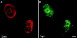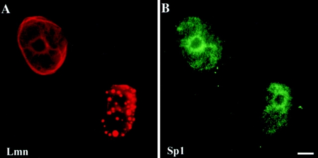 Figure 5. Disruption of lamin organization does not alter the distribution of Sp1. BHK 21 cells were microinjected with ΔNLA. Cells were stained with rabbit anti–human LA (A) and a monoclonal anti–human Sp1 (B). The cell on the left in each panel was not injected with ΔNLA and displays normal lamin and Sp1 staining. The cell on the right was injected with ΔNLA, and although lamin organization is disrupted, it also displays a normal distribution of Sp1. Bar, 5 μm.
