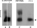 Figure 4. Disruption of lamin organization inhibits the synthesis of mRNA-sized products in embryonic nuclei. The size of transcription products synthesized in the embryonic extract was determined by the addition of [α32P]UTP. After 15 min, total RNA was prepared from each sample and resolved by denaturing gel electrophoresis, and the dried gel was used for autoradiography. The addition of α-amanitin (10 μg/ml) blocked the synthesis of upper molecular weight products (bracket, compare A and B). Alternatively, buffer (control) or ÎNLA (D) was added to embryonic extracts 1 h before the addition of [α32P]UTP. The incorporation of [32P]UTP into upper molecular weight products was inhibited by disruption of LB3 organization, whereas the synthesis of products the size of tRNA (arrow) was not affected.