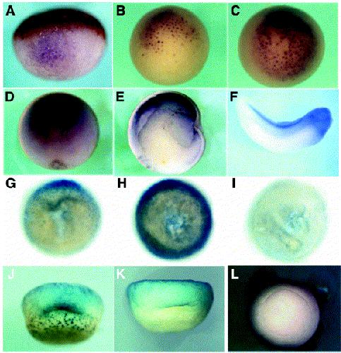 Fig. 3. Patterns of expression of Mig30 mRNA and Mig30 protein. (AâF) Mig30 expression during early Xenopus development. (A) Dorsal view of the late blastula (stage 9). No blastopore pigment is seen. (B) Vegetal view of early gastrula (stage 10). Dorsal is up. (C) Vegetal view of early gastrula (stage 10+). Dorsal is up. (D) Dorsal view of late gastrula (stage 12). Anterior is up. (E) The same embryo in (D) was hemisectioned sagittally. Dorsal is to the left. Anterior is up. (F) Lateral view of the tailbud (stage 31). (GâI) Mig30 expression of manipulated gastrula embryos (stage 10+). Embryos were cleared in Murray's clearing solution. (G) Vegetal view of an untreated control embryo. Dorsal is up. (H) An embryo dorsalized by LiCl treatment (I). An embryo ventralized by UV irradiation. (JâL) Localization of Mig30 protein. (J) Dorsal view of an early gastrulaembryo (stage 10+). (K) An embryo incubated with normal rabbit IgG as primary antibody (stage 10+). (L) Vegetal view of an embryo coincubated with anti-Mig30 antibody and antigen peptide. Dorsal is up.