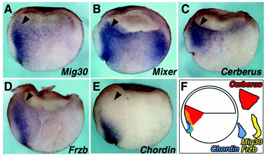 Fig. 5. Overexpression of Mig30 inhibits head development. (A) Embryos (stage 40) injected with 500 pg Mig30 mRNA into two dorsal blastomeres at the four-cell stage. Anterior structures are affected. (B) Expression pattern of Xotx5 in embryos (stage 31) injected with 500 pg Mig30 mRNA into all blastomeres at the four-cell stage. The embryo at the top was not injected. (C) An embryo injected with 250 pg IGD mRNA into two dorsal blastomeres at the four-cell stage, showing the APDI 1 phenotype. (D) Enlarged view of the bottom embryo in (E), showing abnormal retina formation. (E) Embryos were injected with 250 pg CRD mRNA into two dorsal blastomeres at the four-cell stage. The head is slightly enlarged compared with the control embryo. The embryo at the top was not injected. (F) Coinjection of Mig30 mRNA abolished the effect of CRD mRNA.