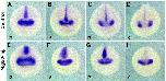 Fig. 8. Overexpression of Mig30 can inhibit convergent extension movements. (AâG) Mig30 mRNA was injected into all blastomeres in the animal pole region at the four-cell stage. The animal caps were cut at late blastula stage, exposed to activin (5 ng/ml) for 3 h. Elongation of the animal caps was observed 15â17 h after dissection. (A) Uninjected animal caps were left untreated. (B) Those treated with activin showed elongation. (CâF) Animal caps injected with 250 pg Mig30 mRNA (C), 500 pg Mig30 mRNA (D), 1 ng Mig30 mRNA (E) or 1 ng GFP mRNA (F) were treated with activin. The caps injected with Mig30 mRNA showed no elongation, whereas those injected with GFP mRNA elongated. (G) RT-PCR analysis of expression of mesodermal or endodermal markers in animal caps injected with Mig30 mRNA. Markers were analyzed at stage 10. (H,I) Cell lineage analysis. (H) Embryos were injected with 200 pg of β-gal mRNA into two dorsal blastomeres at the four-cell stage. The embryos were fixed at early neurula stage (stage 16) and β-gal activity was visualized. The β-gal-positive cells are concentrated on the dorsal midline. (I) Embryos coinjected with 200 pg of β-gal and 500 pg of Mig30 mRNA. β-gal-positive cells spread mediolaterally and showed little elongation along the anteroposterior axis. Bottom is an embryo in which the blastopore failed to close.