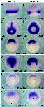 Fig. 6. Positional relationship between midline structures and eye field in Mig30-injected embryos. After injecting 500 pg Mig30 mRNA into two dorsal blastomeres at the four-cell stage, the embryos were analyzed by in situ hybridization for expression of shh and Rx1. shh and Rx1 demarcate the midline structures and eye field, respectively. (AâD) Control embryos. (EâH) Mig30-injected embryos. (A,E) Stage 13. (B,F) Stage 15. (C,G) Stage 17. (D,H) Stage 19.