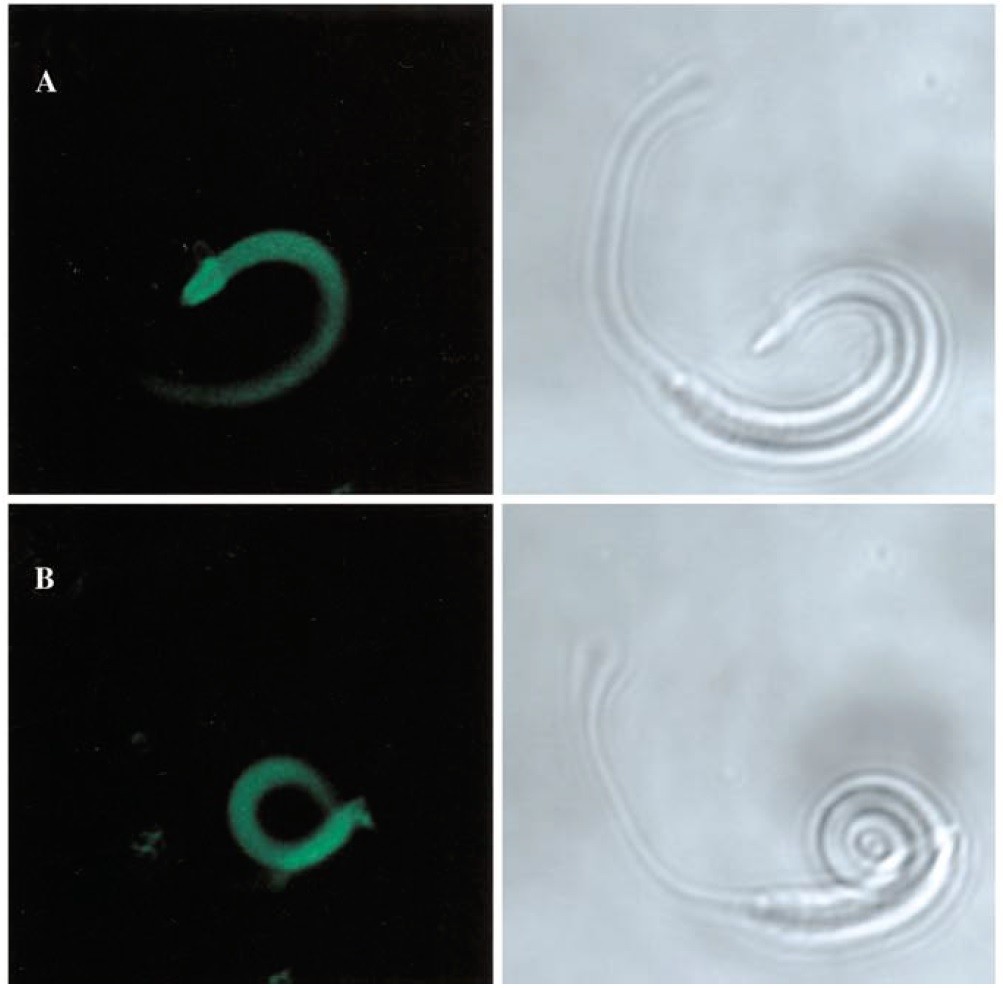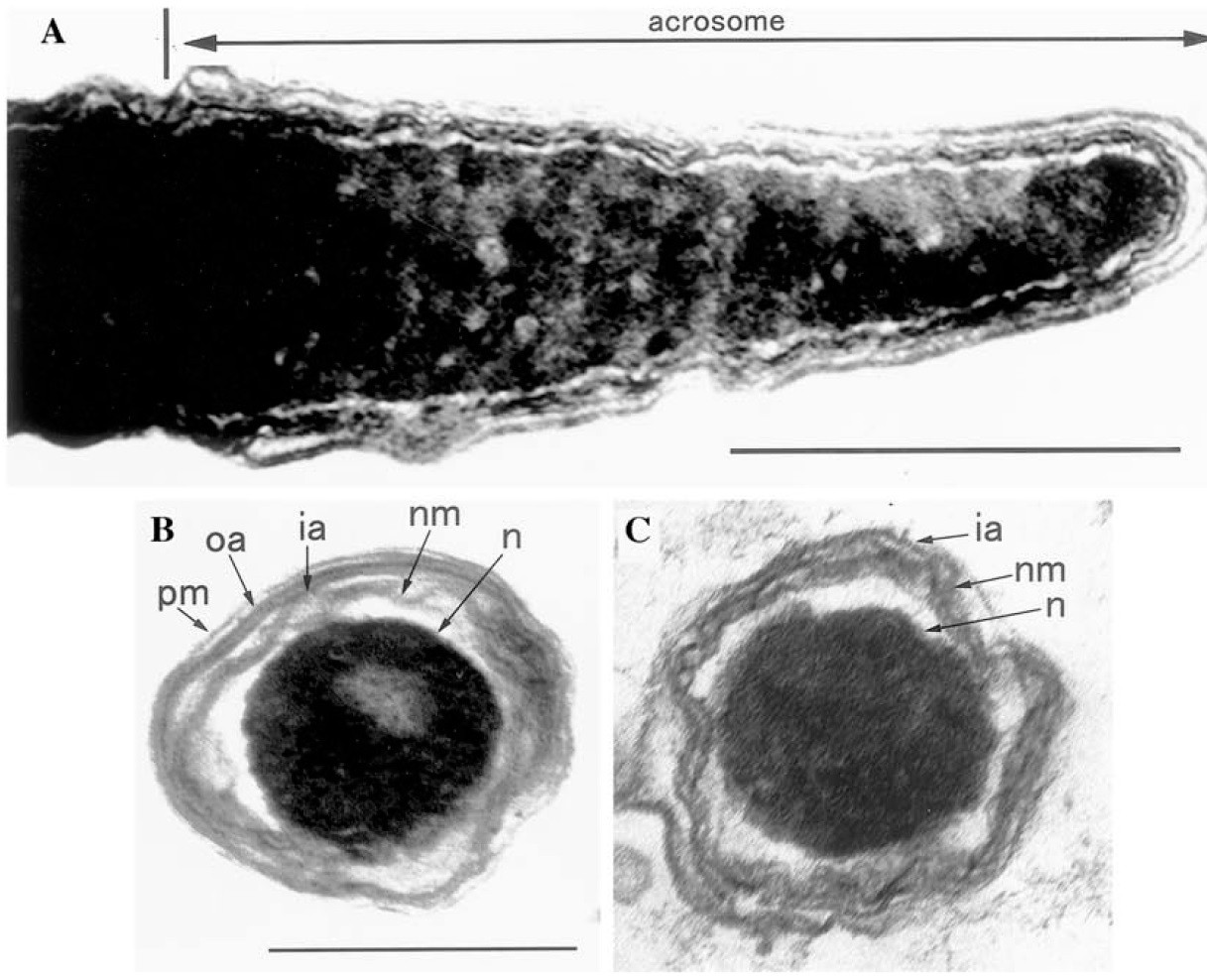 Previous electron microscopic observations have shown that the acrosome of the sperm of the frog, Xenopus laevis, comprises a membrane-bounded vesicle covering the anterior-most position of the head. We obtained a sperm suspension from the testes and stained it with LysoSensor Green for observation under a confocal laser scanning microscope and found a bright fluorescence reflecting the presence of the acrosomes at the top of the sperm head in about 64% of the sperm, with no deterioration of their capacity to fertilize. About 40% of the sperm with an acrosome underwent an acrosome reaction in response to Ca(2+) ionophore A23187, as evidenced by a loss of LysoSensor Green stainability, accompanied by breakdown of the acrosomal vesicle. About 53% of the sperm bound to isolated vitelline envelopes underwent an acrosome reaction, whereas both jelly water and solubilized vitelline envelopes weakly induced an acrosome reaction. When the sperm were treated with an oviductal extract obtained from the pars recta, but not the pars convoluta region, about 40% of the sperm with acrosomes underwent an acrosome reaction. The substance containing acrosome reaction-inducing activity in the pars recta extract seemed to be a heat-unstable substance with a molecular weight of greater than 10 kDa. The activity was not inhibited by protease inhibitors but required extracellular Ca(2+) ions. These results indicate that the acrosome reaction occurs on the vitelline envelopes in response to the substance deposited from the pars recta during the passage of the oocytes through the oviduct.
