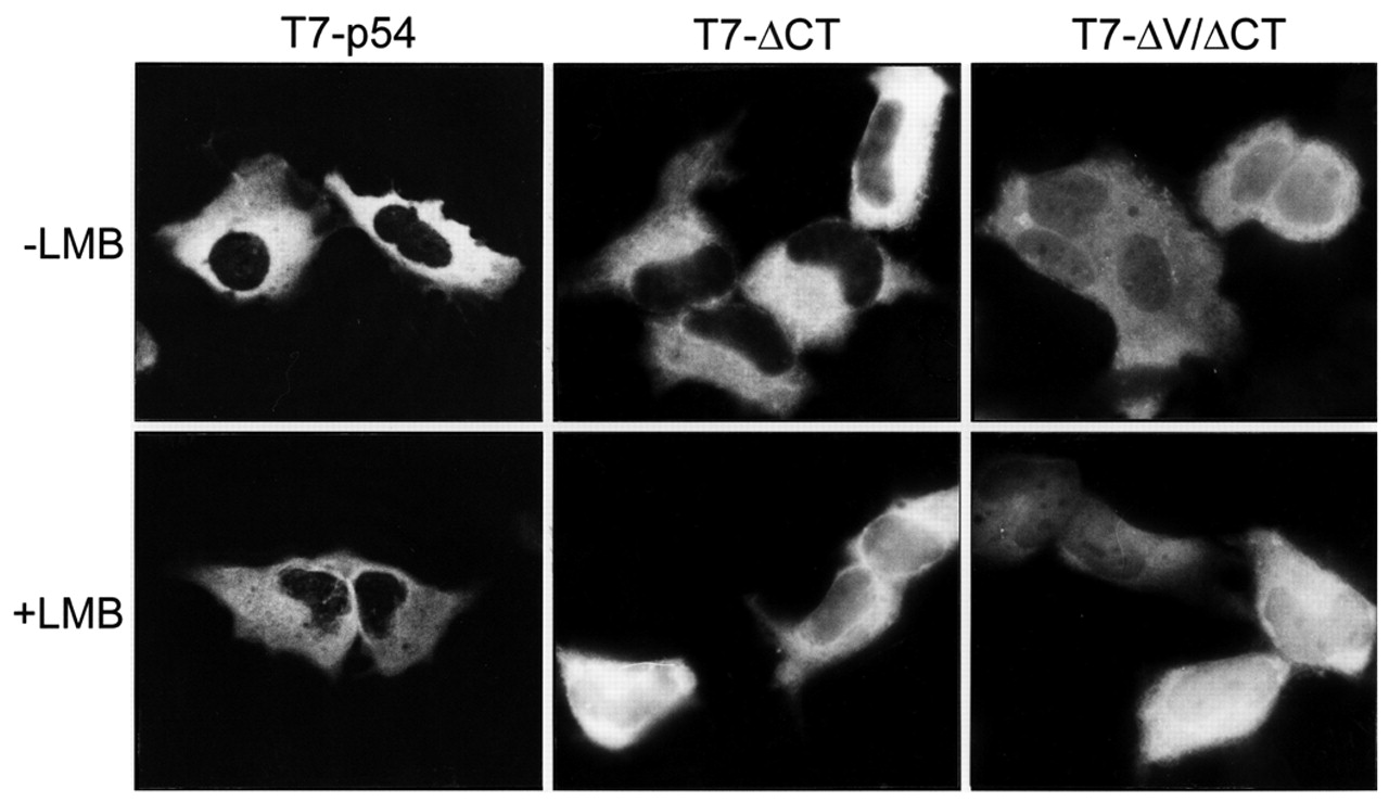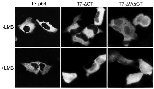 The C-terminal region of Xp54 acts as a cytoplasmic retention signal in HeLa cells. Cells expressing T7-p54, T7-δCT and T7-δV/δCT were incubated for four hours in the presence or absence of 5 nM LMB. Fluorescence images were obtained by immunostaining with anti-T7 IgG and FITC-conjugated anti-mouse IgG.