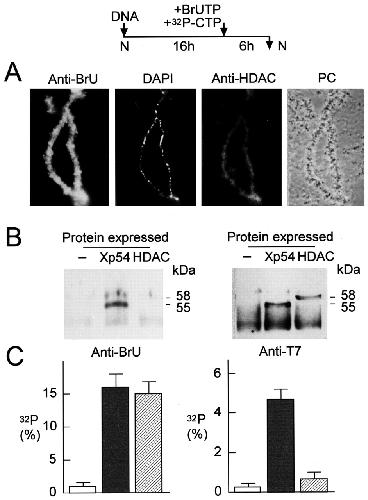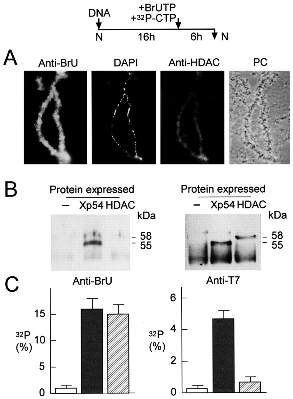 Recombinant Xp54 associates with de novo synthesized RNA. Stage III/IV oocytes expressing T7-p54 and T7-tagged histone deacetylase (HDAC) were injected with 0.1 μg of BrUTP and 0.1 μCi of 32P-CTP six hours before isolation of nuclei. (A) Double immunostaining of lampbrush chromosomes using anti-BrdU mouse monoclonal and anti-HDAC rabbit polyclonal. Immunofluorescent (FITC-conjugated anti-mouse IgG and TRITC-conjugated anti-rabbit IgG), DAPI and phase contrast (PC) images of a representative bivalent are shown. (B) Immunoprecipitation of T7-Xp54 and T7-HDAC from nuclear extracts using anti-BrdU and anti-T7 monoclonals. Nuclear extracts from non-injected oocytes (â) are shown as negative controls. (C) Immunoprecipitation of 32P-labelled RNA from nuclear extracts similar to those in (B) using anti-BrdU IgG and anti-T7 IgG is shown.