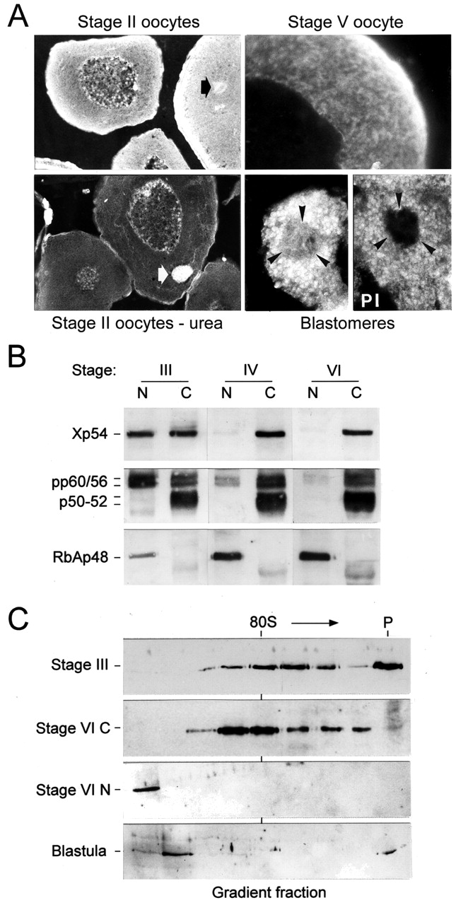 Xp54 helicase is redistributed between the nucleus and the cytoplasm and between large and small complexes during the course of early development. (A) Sections through the ovary (with or without prewash in 4 M urea) and the blastula, both immunostained with anti-p54. Nuclear particles and fibres are obvious in stage I/II oocytes and in blastomere on left (arrowheads). The blastomere on the right is stained with preimmune serum (PI) and shows no nuclear reaction (arrowheads), only autofluorescent yolk. Arrows on oocytes indicate the Balbiani body. (B) The level of Xp54 in the nucleus relates to the level of transcriptional activity. An immunoblot of isolated nuclei (N) and cytoplasms (C) from mid- to late-oogenesis with anti-p54, anti-pp60/56, anti-p50-52 and anti-RbAp48. (C) Extracts (SN10) from stage III oocytes, stage VI cytoplasms, stage VI nuclei and blastula, separated on glycerol gradients and immunoblotted with anti-p54 are shown.
