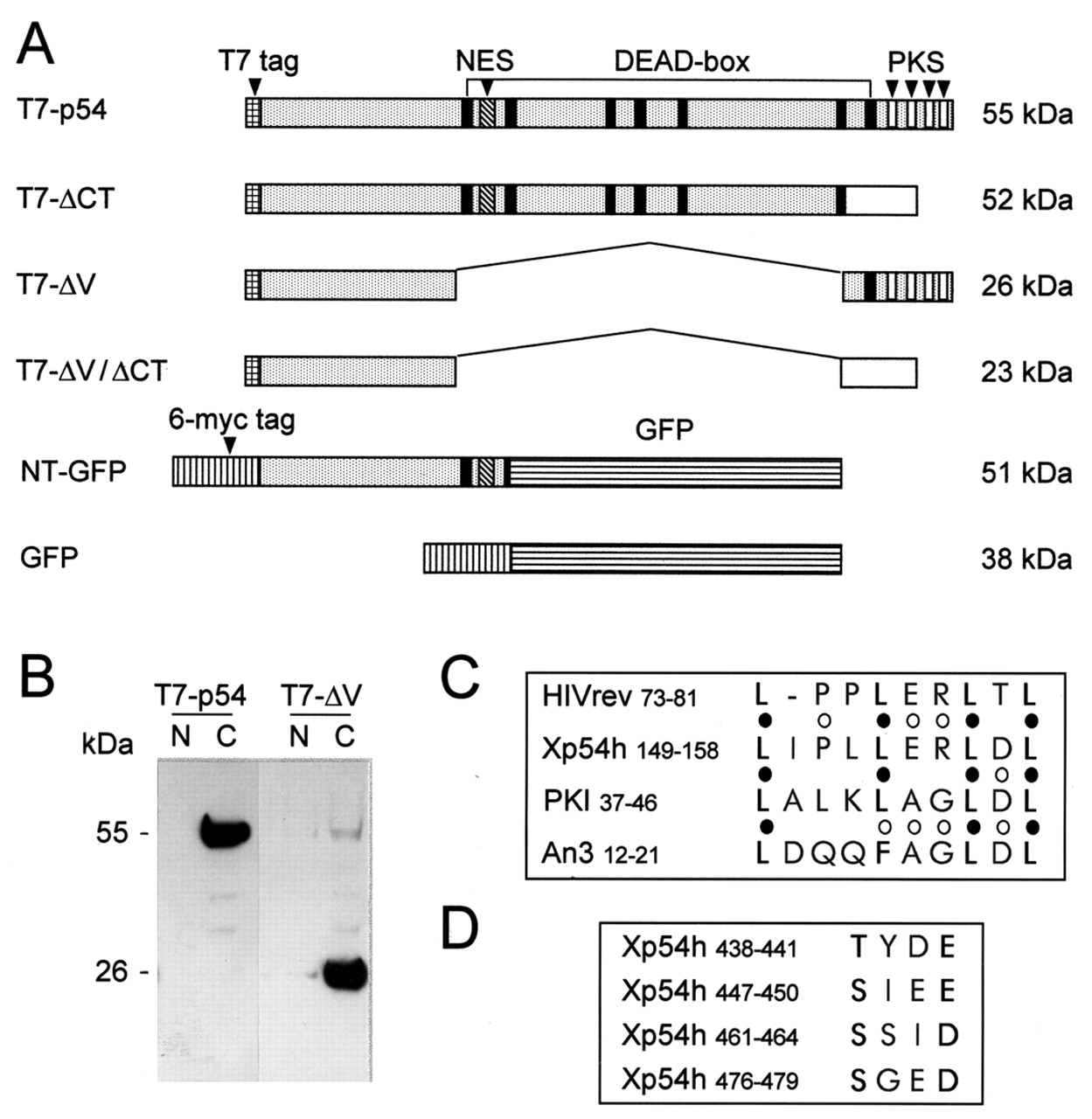 Recombinant forms of Xp54 and identification of potential NES and phosphorylation sites. (A) A diagram of recombinant proteins expressed in this study. The black boxes represent the conserved motifs seen in all DEAD-box helicases. Locations of a potential NES (cross-hatched) and four potential CK2 phosphorylation sites (PKS, white boxes) are indicated. Various fragments of Xp54 (grey areas) were expressed either with a T7 epitope-tag or as GFP fusions containing a 6-myc tag. The white areas to the right in T7-δCT and T7-δV/δCT represent replacement of the C-terminus of Xp54 with an unrelated sequence encoded by the plasmid. (B) An immunoblot of T7-p54 and T7-δV, overexpressed in stage VI oocytes, showing cytoplasmic (C) but no nuclear (N) reaction. (C) Comparison of the leucine-rich sequence of Xp54 with the NES of HIV Rev ( Fornerod et al., 1997), PKI ( Hauer et al., 1999) and An3 ( Askjaer et al., 2000). Positions of critical leucines (black circles) and other similarities (open circles) are indicated. The numbers refer to the residue positions starting from the initiating methionine. (D) The four potential CK2 phosphorylation sites (S/TxxD/E, where x is any non-basic residue) are located near the C-terminus of Xp54.