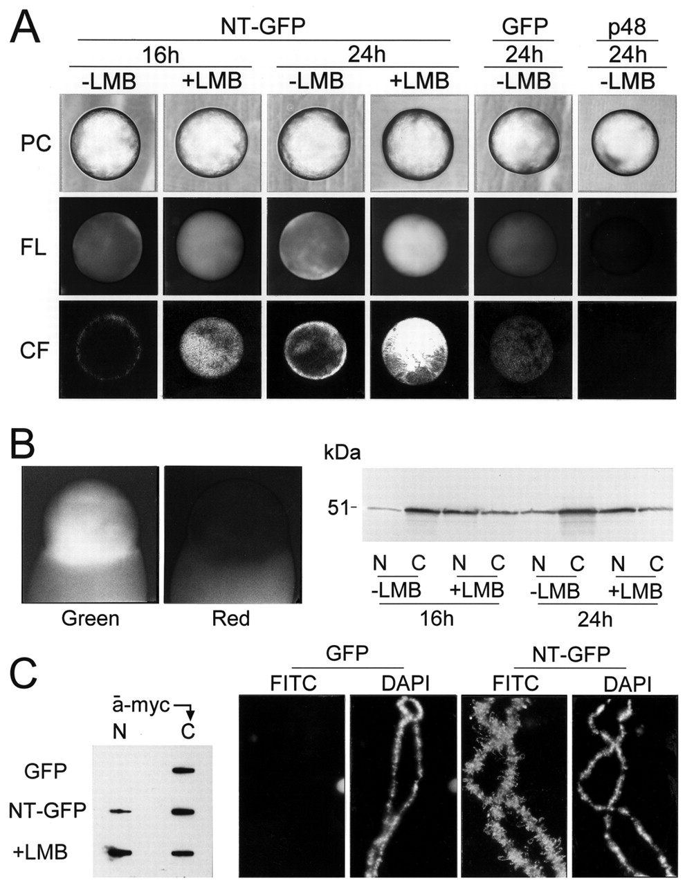Treatment of injected stage VI oocytes with 50 nM LMB results in nuclear accumulation of the N-terminal region of Xp54 fused to GFP. (A) Oocyte nuclei, isolated 16 and 24 hours after injection with plasmids expressing NT-GFP, GFP or T7-RbAp48 (p48), viewed by phase microscopy (PC), direct fluorescence (FL) and confocal fluorescence (CF) are shown. (B) (left) A nucleus and cytoplasm from an oocyte injected with NT-GFP, treated with LMB and viewed for green and red fluorescence. (right) An immunoblot, using anti-myc IgG, of expressed NT-GFP present in the nucleus and cytoplasm 16 and 24 hours after plasmid injection. Injected oocytes were incubated with or without LMB. Protein equivalents of five nuclei (N) and one cytoplasm (C) were separated by SDS-PAGE. (C) (left) Translocation into the nucleus of anti-myc IgG from 20 ng injected into the cytoplasm of oocytes expressing GFP and NT-GFP with or without LMB. The anti-myc IgG was detected on slot blots with an HRP-conjugated anti-mouse IgG. (right) Translocation of anti-myc IgG injected into the cytoplasm of stage IV oocytes onto the RNP matrix of lampbrush chromosomes is shown. Anti-myc IgG was detected, after incubation of chromosome spreads from oocytes expressing NT-GFP or GFP, with FITC-conjugated anti-mouse IgG. Location of the chromosomal axis is seen by post-staining with DAPI.