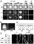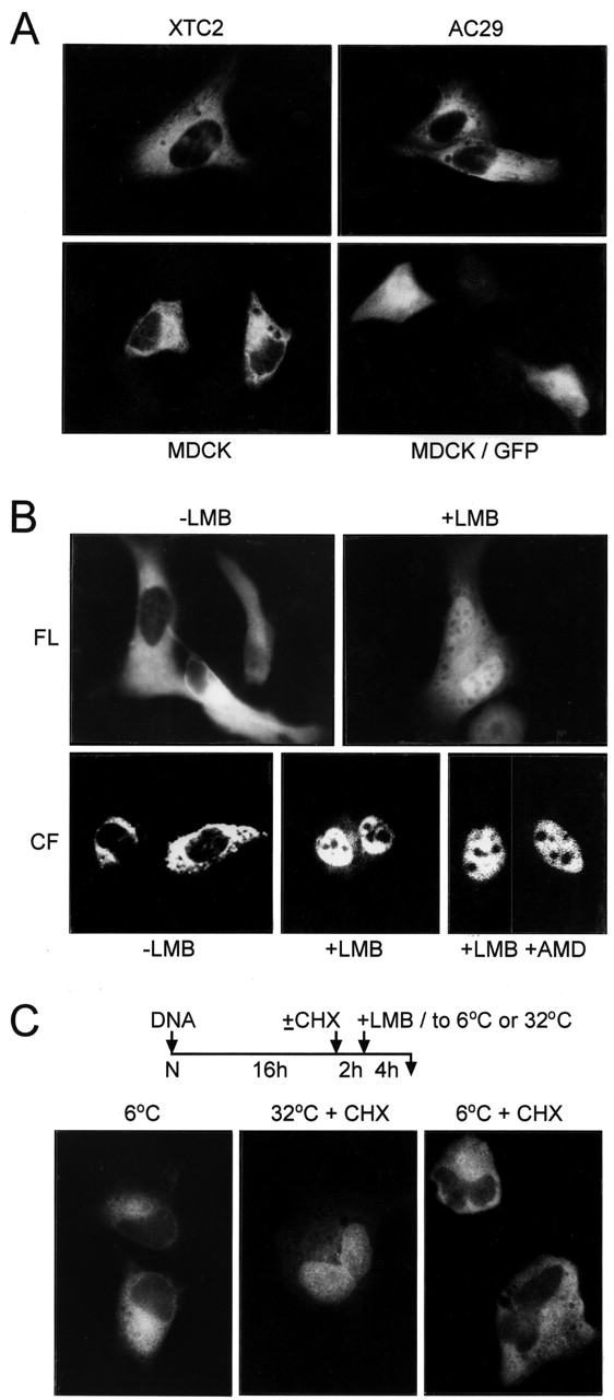 The N-terminal region of Xp54 fused to GFP behaves like a shuttling protein in transfected culture cells. (A) Fluorescence images of Xenopus XTC2 cells, mouse AC29 cells and canine MDCK cells expressing NT-GFP and MDCK cells expressing GFP. (B) Treatment of transfected HeLa cells with 5 nM LMB for four hours prior to fixation results in nuclear accumulation of NT-GFP. Fluorescence (FL) and confocal (CF) images are shown. Cells were treated with 5 μg/ml actinomycin D (AMD) two hours before treatment with LMB. (C) Cold, but not treatment with cycloheximide (CHX), inhibits LMB-dependent nuclear accumulation of NT-GFP in transfected HeLa cells. The fluorescence images are of cells cooled to 6°C after addition of LMB; cells treated with 20 μg/ml CHX for two hours prior to addition of LMB and maintained at 32°C and cells treated with CHX and cooled to 6°C.