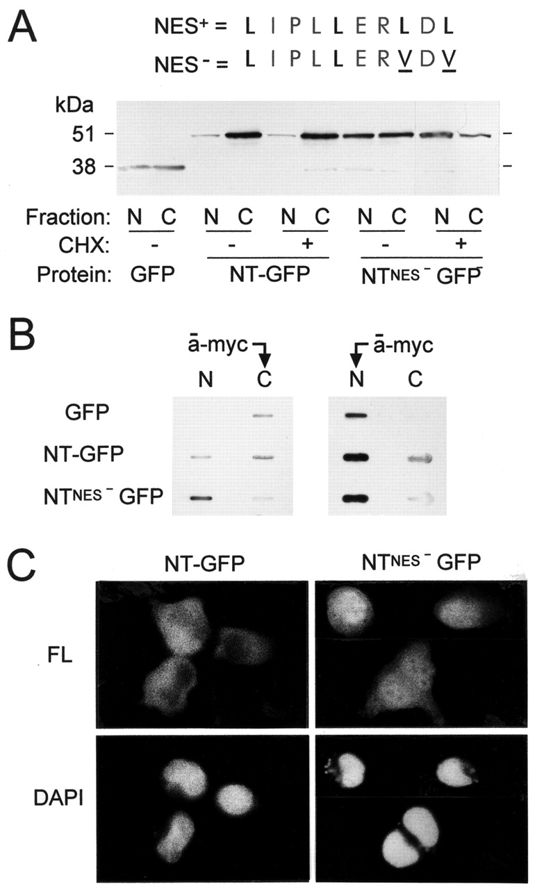 Mutation of the leucine-rich NES impairs export of NT-GFP. (A) Leucine residues were mutated to valines at the two positions shown. An immunoblot of nuclei and cytoplasms isolated from oocytes expressing GFP, GFP-NT and GFP-NTNESâ in the presence and absence of CHX (50 μg/ml) is shown. (B) Translocation of anti-myc IgG from the cytoplasm to the nucleus and from the nucleus to the cytoplasm in oocytes expressing GFP, GFP-NT and GFP-NTNESâ is shown. (C) The green fluorescence (FL) and DAPI images are of HeLa cells expressing GFP-NT and GFP-NTNESâ.