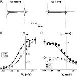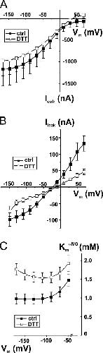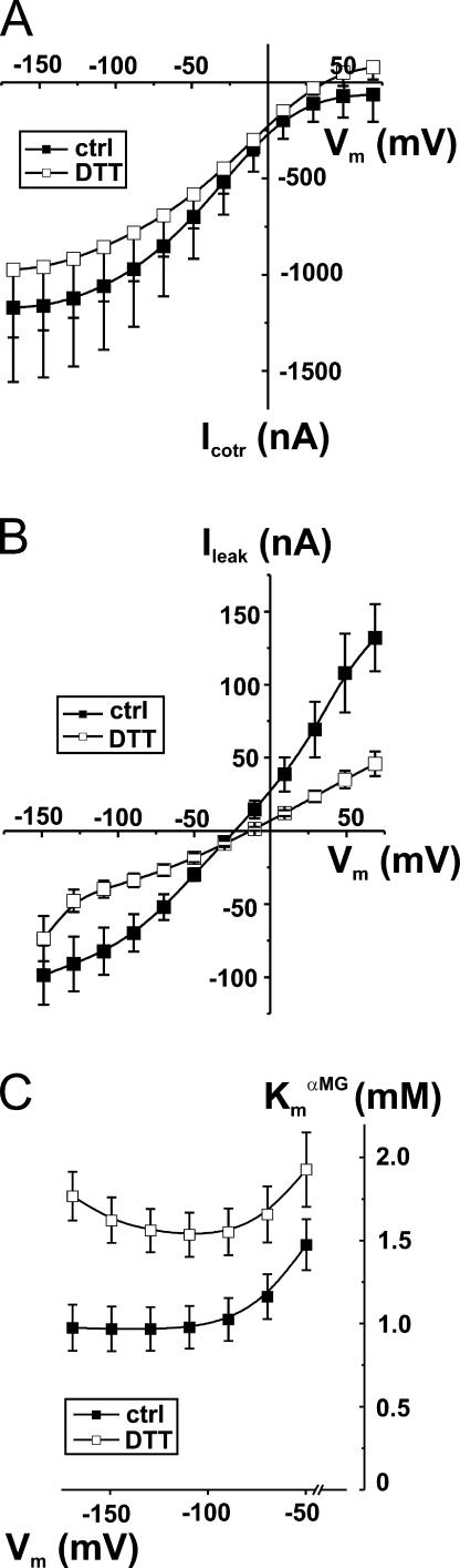 Figure 1. Effects of DTT exposure on steady-state parameters of wt Na+/glucose cotransporter (wt SGLT1). (A) Effect of DTT on αMG cotransport current (Icotr) of wt SGLT1. Estimation of the currents was done under control conditions (filled symbols) and in the presence of DTT (2.5 mM) (open symbols) on each oocyte (n = 3, paired experiments). (B) Effect of DTT on Na+ leak current (Ileak) of wt SGLT1. A 30-min exposure with 10 mM DTT was done before the experimental test of Ileak (done in the presence of DTT) (n = 6 for control conditions, filled symbols, n = 5 for DTT, open symbols, unpaired experiments). (C) Effect of DTT on apparent affinity for αMG (KmαMG) as a function of membrane potential (Vm). Estimation of the apparent affinity for αMG was done under control conditions (filled symbols) and in the presence of DTT (2.5 mM) (open symbols) on each oocyte (n = 4, paired experiments). |