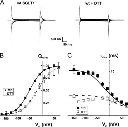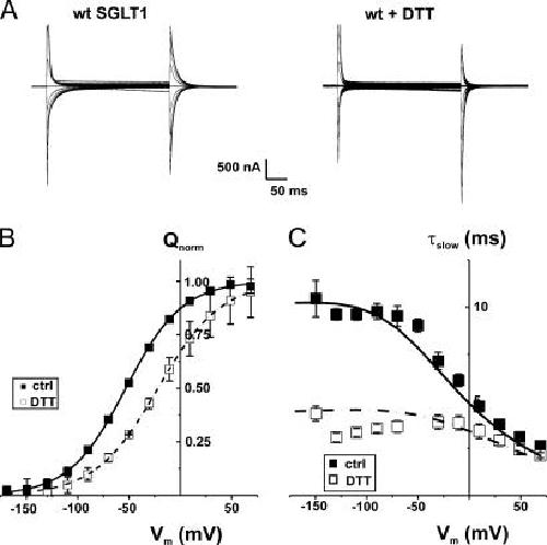 Figure 2. Effect of DTT exposure on presteady-state parameters of wt Na+/glucose cotransporter (wt SGLT1). (A) Presteady-state currents (Pz-sensitive currents in the absence of glucose) of a typical oocyte expressing wt SGLT1 under control conditions and after exposure to DTT (30 min preincubation with 10 mM DTT, with DTT present in subsequent experimental solutions). (B) Effect of DTT on transferred charges (Q-V curve) of wt SGLT1. Q-V curves were fitted with a Boltzmann equation (see MATERIALS AND METHODS), adjusted to 0 at hyperpolarizing voltages and normalized with respect to the extrapolated Qmax (n = 9 for control conditions, filled symbols, n = 6 for DTT, open symbols, unpaired experiments). (C) Time constant of the 10-ms component of presteady-state currents of wt SGLT1 compared with wt + DTT. The curves represent the time constants evaluated with a four-state model of presteady-state currents with parameters described in Table I. |