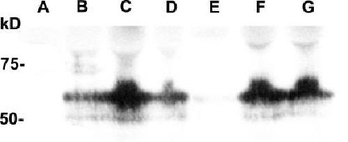 Figure 4. Western blot analysis of some selected mutants, compared with wt SGLT1, detected with an anti-myc antibody. Extracts enriched in plasma membrane were purified from noninjected oocytes (A), wt SGLT1–injected oocytes (B), and mutants C345A (C), C351A (D), C355A (E), and C361A (F) and double mutant C522,560A (G) and were loaded onto a polyacrylamide gel (equivalent to membranes from 20 oocytes), and protein equivalencies were confirmed by Ponceau Red staining. Molecular standard masses are indicated on the left (in kD) (New England Biolabs). |