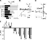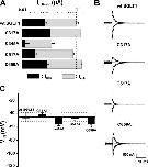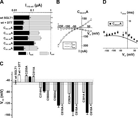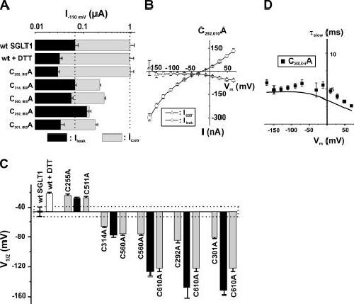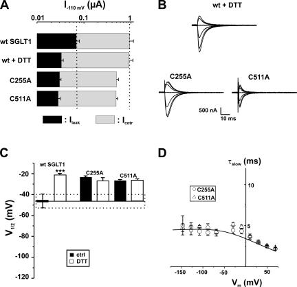 Figure 7. Electrophysiological characteristics of mutants classified in Group C, as compared with wt SGLT1, with and without DTT. (A) Comparison of mutant SGLT1s activities to that of wt SGLT1 and to wt SGLT1 + DTT. Maximal αMG cotransport (Icotr at 5 mM αMG) and Na+ leak (Ileak) currents were measured at −110 mV. The dotted lines indicate the mean expression level of wt SGLT1. n ≥ 5 for each mutant. (B) Off response of presteady-state currents (Pz-sensitive currents in the absence of glucose) of typical oocytes expressing wt SGLT1 exposed to DTT and mutants C255A and C511A. (C) V1/2 of mutant SGLT1s as compared with that of wt SGLT1 (filled bars) and to wt SGLT1 and mutants exposed to DTT (open bars). The dotted box represents the interval for which V1/2 of a mutant would not be significantly different from that of wt SGLT1. (D) Time constants of the slow component of presteady-state currents for mutants of Group C. The curves represent the time constants evaluated with a four-state model of presteady-state currents with parameters described in Table I. Errors are SEM. |
