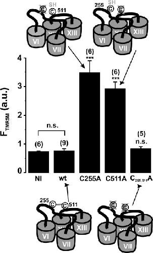 Figure 10. Fluorescent labeling of oocytes expressing mutants C255A, C511A, and C255,511A as compared with wt SGLT1. See MATERIALS AND METHODS for the procedure of fluorescent labeling with the TMR5M fluorescent probe. The fluorescence signal is indicated in arbitrary units (a.u.). NI indicates noninjected oocytes. The number of oocytes used per sample is indicated in parentheses. A cartoon shows the availability of cysteine residues in each situation. Stars indicate the statistical significance for unpaired Student's t test against wt SGLT1 data (see Fig 5 legend). Errors are SEM. |
