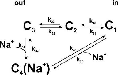 Figure 11. Kinetic model of the Na+/glucose cotransporter states for the estimation of presteady-state currents. The model was previously described in Chen et al. (1996). See Appendices A and B for details. |