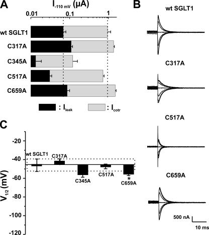 Figure 5. Electrophysiological characteristics of mutants classified in Group A, as compared with wt SGLT1. (A) Comparison of mutant SGLTs activities to that of wt SGLT1. Maximal αMG cotransport (Icotr at 5 mM αMG) and Na+ leak (Ileak) currents were measured at −110 mV. The dotted lines indicate the mean expression level of wt SGLT1. n ≥ 5 for each mutant. (B) Off response of presteady-state currents (Pz-sensitive currents in the absence of glucose) of typical oocytes expressing each of the mutant SGLT1s compared with an oocyte expressing wt SGLT1. (C) V1/2 of mutant SGLT1s as compared with that of wt SGLT1. A dotted box represents the interval for which V1/2 of a mutant would not be significantly different from that of wt SGLT1. Errors are SEM. Asterisks indicate the statistical significance with respect to wt SGLT1 (*, P ≤ 0.05; **, P ≤ 0.01; ***, P ≤ 0.001). |