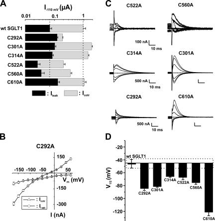 Figure 6. Electrophysiological characteristics of mutants classified in Group B, as compared with wt SGLT1. (A) Comparison of mutant SGLT1 activities to that of wt SGLT1. Maximal αMG cotransport (Icotr at 5 mM αMG) and Na+ leak (Ileak) currents were measured at −110 mV. The dotted lines indicate the mean expression level of wt SGLT1. n ≥ 5 for each mutant. (B) I-V curve for αMG cotransport and Na+ leak currents of C292A. (C) Off response of presteady-state currents (Pz-sensitive currents in the absence of glucose) of typical oocytes expressing each of the mutant SGLT1s. (D) V1/2 of mutant SGLT1s as compared with that of wt SGLT1. A dotted box represents the interval for which V1/2 of a mutant would not be significantly different from that of wt SGLT1. Errors are SEM. All V1/2 values for this series of mutants were significantly different (P < 0.001 in each case) from the V1/2 of wt SGLT1. |