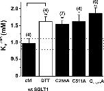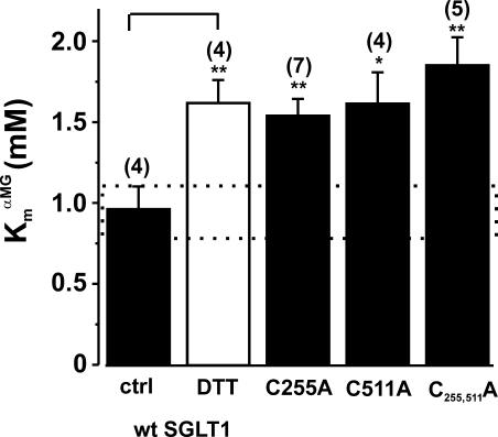Figure 8. Apparent affinity for αMG (KmαMG) for oocytes expressing mutants C255A, C511A, and C255,511A compared with wt SGLT1, with and without DTT. The application of DTT to wt SGLT1 was performed as described in MATERIALS AND METHODS (paired experiments). The affinity was assessed with data measured at −150 mV. The dotted box represents the interval for which the KmαMG of a mutant would not be significantly different from that of wt SGLT1. The number of individual oocytes used per value is indicated in parentheses. Errors are SEM. Stars indicate the statistical significance (see Fig 5 legend). |