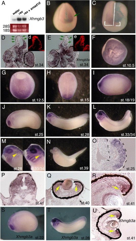 Fig. 1. Expression of Xhmgb3 mRNA and regulation of Xhmgb3 by rax. (AâE) Regulation of Xhmgb3 mRNA (AâD) or Xhmgb3a mRNA (E) by rax. Induction of Xhmgb3 (A and B) by rax overexpression. Reduction of Xhmgb3 (C and D) or Xhmgb3a (E) by rax MO injection. Northern blot analysis of total RNA isolated from animal caps injected with water, rax or rax + smad10 RNAs. The cDNA fragment encoding for entire protein of Xhmgb3 was used as a labeled probe (A). The lower panel shows Ethidium Bromide (EtBr) staining of ribosomal RNA (A). In situ hybridization using a probe of Xhmgb3 for embryos injected with rax and β-gal RNAs (stages 18/19) (B) or rax MO (1 pmol) and β-gal RNA (stages 17/18) (C) into one dorsal blastomere at 4- or 8-cell stage on the animal side. Anterior view with dorsal to the top (B) or anteriorâdorsal view (C). Section in situ hybridization using a probe of Xhmgb3 (D) or Xhmgb3a (E) followed by immunostaining against β-gal for embryos injected with rax MO (0.5 pmol) and β-gal RNA. The injected side or areas are indicated by β-gal activity in blue (B and C) or by β-gal immunostaining in red (D and E) and also indicated by green arrows (B, D and E). White brackets at both sides of midline indicate the anterior expression of Xhmgb3 in rax MO-injected and control side (C). (FâU) The expression of Xhmgb3 (FâR) or Xhmgb3a (SâU). Animal view at stage 10.5 (F). Dorsal views with anterior to the bottom at stage 12.5 (G) and stage 15 (H). Lateral views with the anterior to the left (IâN) at stages 18/19 (I), stage 25 (J), stage 28 (K), stages 33/34 (L), higher magnifications of panels K and L (M), and stage 39 (N). Yellow arrowheads indicate otic vesicles (M). (O) A cryosection of Xenopus optic vesicle at stage 25 following whole mount in situ hybridization using a probe of Xhmgb3. Black dotted lines delineate an optic vesicle. (PâR) Section in situ hybridization using a probe of Xhmgb3 for Xenopus forebrain (P) or retina at stages 40â41 (Q and R). (SâU) Expression of Xhmgb3a in embryos (S and T) or in the retina (U). Yellow arrows indicate the expression of Xhmgb3 or Xhmgb3a around CMZ (Q, R and U).