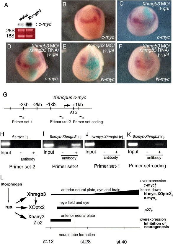 Fig. 7. Xhmgb3 directly activates the transcription of Xenopus c-myc mRNA. (A) Northern blot analysis of total RNA from animal caps injected with water or Xhmgb3 RNA. A cDNA fragment of Xenopus c-myc was used as a labeled probe. Similar results were obtained in at least three independent experiments. The lower panel shows EtBr staining of ribosomal RNA. (BâF) Expression of Xenopus c-myc (BâD) or N-myc (E and F) or Xhmgb3 MO and β-gal RNA (C, E) or Xhmgb3 MO, Xhmgb3 RNA and β-gal RNA (D, F) into one dorsal blastomere at 4- or 8-cell stage on the animal side. Expression was examined at stages 13/14 (BâD) or stages 17/18 (E and F). The injected side is indicated by β-gal activity in blue (CâF). (GâK) ChIP analysis of Xhmgb3 for the c-myc promoter region. (G) Promoter region of Xenopus c-myc gene and designs of primers for PCR. (HâK) ChIP assay with primers for c-myc promoter region (H and I), for distal region with respect to promoter (J) or for c-myc protein-coding region (K). Immunocomplex was obtained from the extract of animal caps expressing 6x myc tag (H) or 6x myc-Xhmgb3 (IâK). ChIP assay was performed at least 4 times independently and showed same results. (L) Model of rax function in CNS development. Each molecule regulated by rax acts at different stages through distinct mechanisms, leading to normal development of the eye and brain.