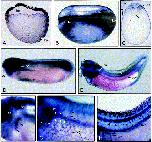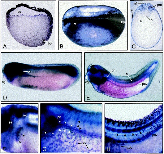 Fig. 2. Whole-mount in situ hybridization. Expression of Xhyal2 during Xenopus embryogenesis. (A) Mid-sagittal section of a gastrula stage embryo, animal side up, dorsal side to the right; bc, blastocoel; bp, dorsal blastopore. (B) Neurula stage 17 embryo, dorsolateral view, anterior side to the right; hf, head folds. (C) Longitudinal section of neurula stage 17 embryo, anterior side up; a, archenteron; e, epidermis; n, notochord; nf, neural fold; pm, prechordal mesoderm. (D) Tailbud stage 28 embryo, lateral view, anterior side to the left; cg, cement gland; pn, pronephros. (E) Tadpole stage 37, lateral view; pcv, posterior cardinal vein. (F) Close-up view of the heart and ear region of a stage 30 embryo rendered transparent by mounting in tetrahydro-naphthaline; ea, eye anlagen; ov, otic vesicle; black triangles mark precursors of the common cardinal veins. (G,H) Close-up views of embryo shown in (E). (G) Nephric region; white triangles mark the forming ureteric duct originating from the pronephros (pn); black triangles mark the intersomitic vessels that end in the posterior cardinal vein; pv, prevascular endothelial cell. (H) Specimen rendered transparent by mounting in tetrahydro-naphthaline; trunk region; black triangles mark the medial part of the notochord.