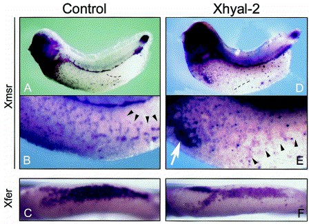 Fig. 6. In situ hybridization of Xmsr and Xfer. Xmsr and Xfer whole-mount in situ hybridization of XHyal2-injected and control embryos. Xmsr expression was used as a marker for PVEC of the primordial vitelline veins. Very little PVEC were detected in the posterior-ventral part of Xhyal2-injected embryos (D,E) when compared to control embryos (A,B). Dashed lines show the boundary on the flanking position of the PVEC pattern. In (B,E) close-up views are presented. Arrowheads indicate the posterior-ventral border of migrating PVEC as indicated by a dashed line in (A,D). Hyperfusion of merging PVEC in Xhyal2-injected embryos is indicated by a white arrow (E). The expression of Xfer, a marker for red blood cells, appeared largely equivalent in XHyal2-injected embryos and controls with subtle individual differences that were also observed in uninjected siblings (C,F).