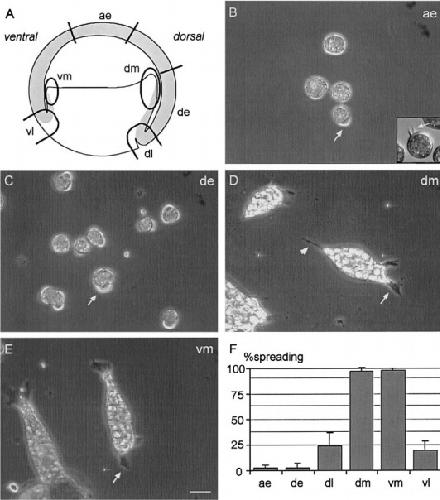 and placed on fibronectin after 1 h. (A) Sketch of an early gastrula embryo. Black areas (explanted regions): dorsal mesendoderm (dm), ventral