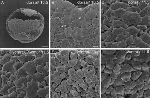 dorsal, stage 11.5. (D) ventral mesendoderm of Xwnt8 mRNA-injected embryo, stage 11.5. (E) ventral stage 10.5. (F) ventral, stage 11.5.