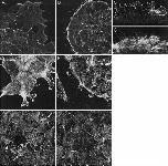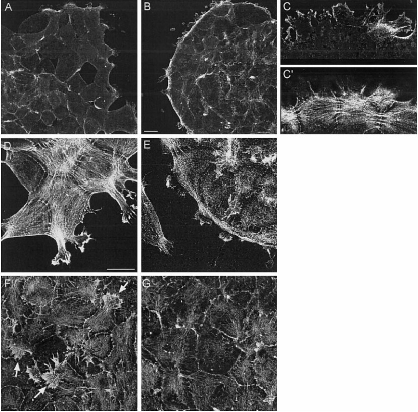 FIG. 9. Actin cytoskeleton of dorsal and ventral mesendodermal explants. Explants on fibronectin, stained with Alexa-green coupled Phalloidin. Confocal images were obtained in stacks with 1 mm intervals and merged. (A and B): Bottom view, substrate-level of explants. (A) Dorsal explant with patches of actin in the periphery. (B) Ventral explant with continuous peripheral actin ring. Bar: 25 mm. (C-E): Top view. (C) Dorsal explant with lamellipodia, 1â3 mm from substrate-level. (C9) Same explant, 5â8) mm from substrate-level, with actin fibres. (D) Dorsal explant with actin network (1â25 mm stack). (E) Ventral explant with actin ring (1â35 mm stack). (F and G) Bottom view, atsubstrate-level. (F) Dorsal explant with lamellipodia (arrows). (G) Ventral explant without large protrusions. Bar: 25 mm.