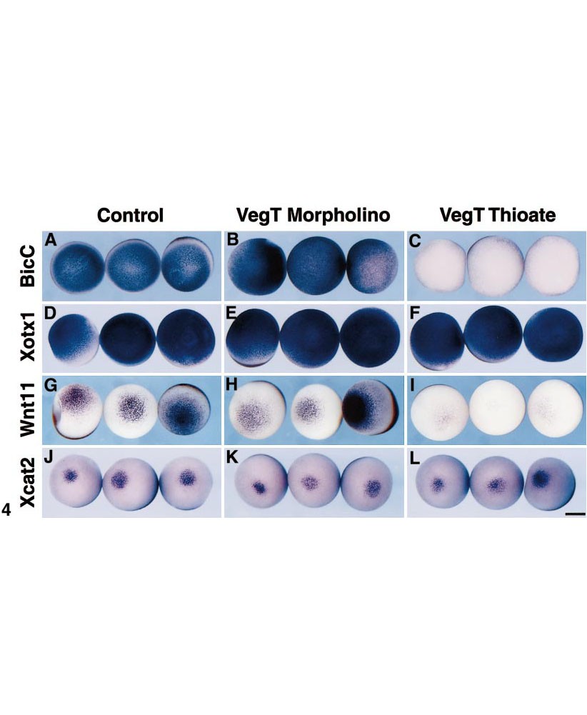 BicC), Xotx1 (D F), Wnt11 (G I), and Xcat2 (J L) localization in uninjected oocytes (Control) and oocytes injected with 30 ng of morpholino