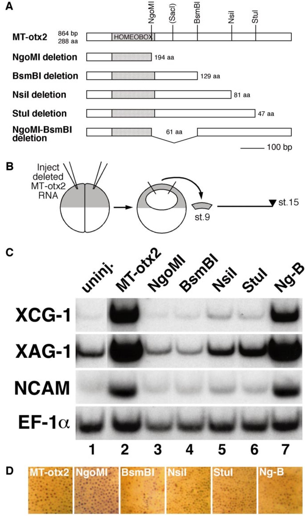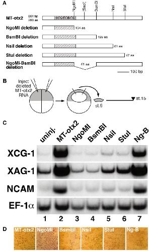 6, StuI deleted MT-otx2; lane 7, NgoMI to BsmBI internally deleted MT-otx2. (D) Embryos injected at the two-cell stage with 100 pg of each