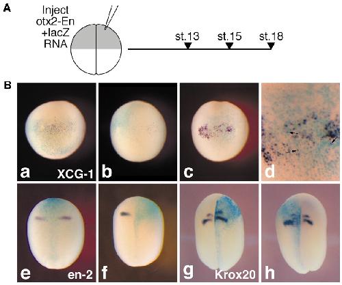 two-cell stage with 100 pg otx2-En or globin control RNA plus 60 pg lacZ RNA. Embryos were allowed to develop until early neurula (stage