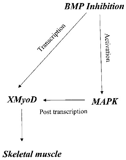 In amphibian development, muscle is specified in the dorsal lateralmarginal zone (DLMZ) of the gastrulaembryo. Two critical events specify the formation of skeletal muscle: the expression of the myogenic transcription factor, XMyoD, and the secretion of bone morphogenetic protein (BMP) antagonists by the adjacent Spemann organizer. Inhibition of BMP signaling during early gastrula stages converts XMyoD protein into an instructive differentiation factor in the DLMZ. Yet, the intracellular signaling factors connecting BMP antagonism and activation of XMyoD remain unknown. Our data show that BMP antagonism induces the activity of mitogen-activated protein kinase (MAPK), and that the activity of MAPK is necessary for muscle-specific differentiation. Treatment of gastrula-stage DLMZ explants with MAPK pathway inhibitors ventralized mesoderm and prevented muscle differentiation. Expression of XMyoD in ventral mesoderm weakly induced muscle formation; however, the coexpression of a constitutively active MEK1 with XMyoD efficiently induced muscle differentiation. Activation of the MAPK pathway did not induce the transcription of XMyoD, but increased its protein levels and transcriptional activity. Thus, MAPK activation is subsequent to BMP antagonism, and participates in the dorsalization of mesoderm by converting the XMyoD protein into a potent differentiation factor.