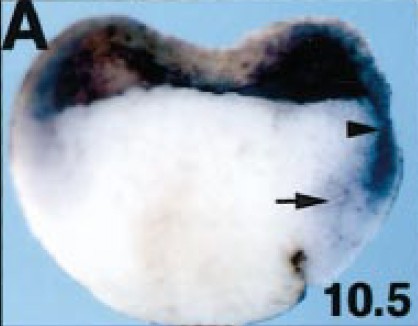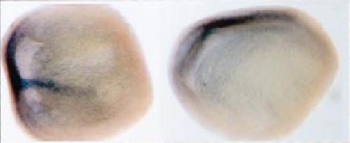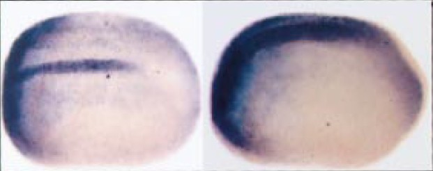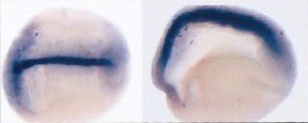 syngr1 (synaptogyrin 1) gene expression in Xenopus laevis embryos, NF stage 13, as assayed by in situ hybridization. Left image: dorsal view, anterior left. Right image: lateral view of bisected embryo: anterior left, dorsal up.